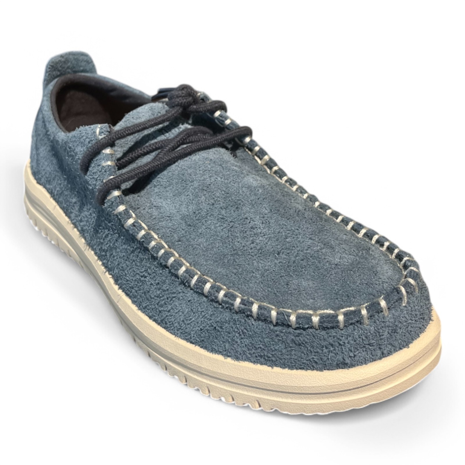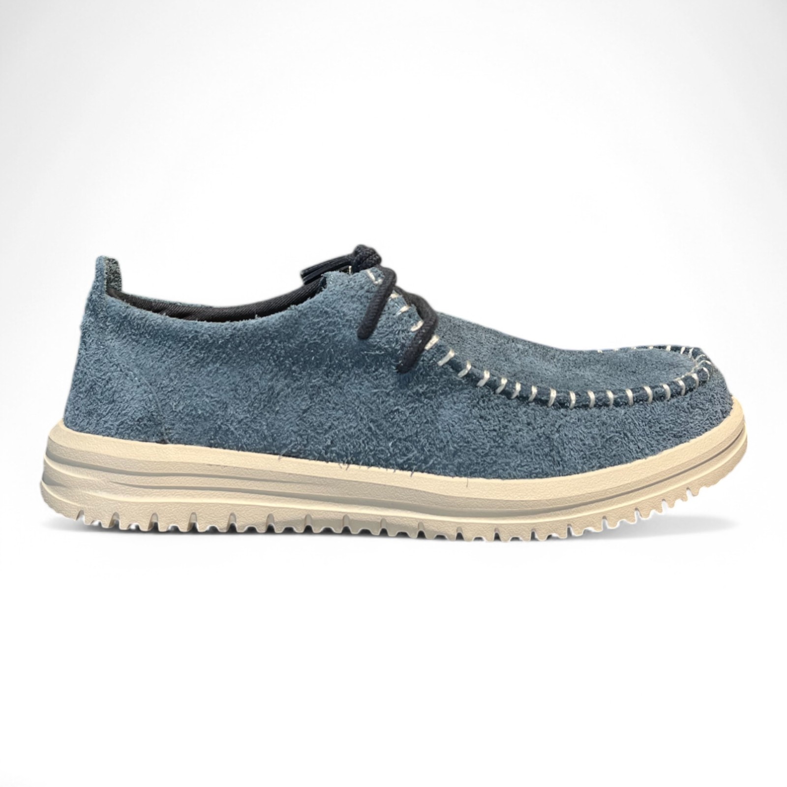 The HEYDUDE Wally NXT Moc Stormy Blue/Wood is a blue loafer with suede upper, leather lining and removable foam insole. It features an easy-on system and a flexible, lightweight outsole. Available at Bottine.